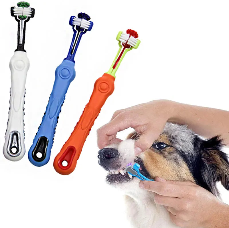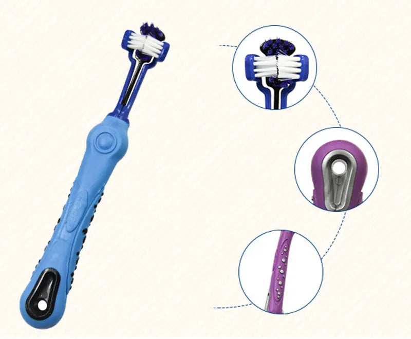 Een handige tandenborstel met drie borstelkanten voor een grondige reiniging van tanden en tandvlees. Helpt tandsteen en slechte adem te verminderen bij zowel honden als katten, ideaal voor dagelijkse mondverzorging.